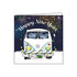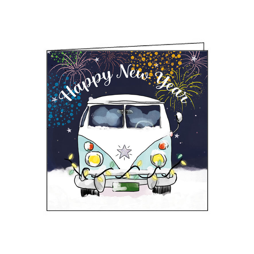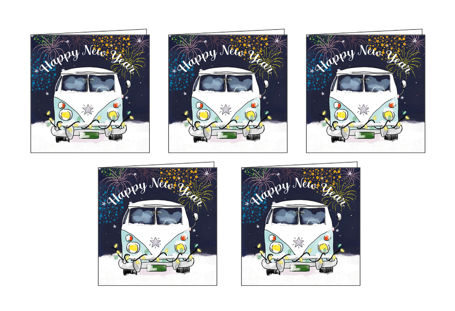 Set van 5 leuke nieuwjaarskaarten met een vintage bus en vuurwerk op de achtergrond.