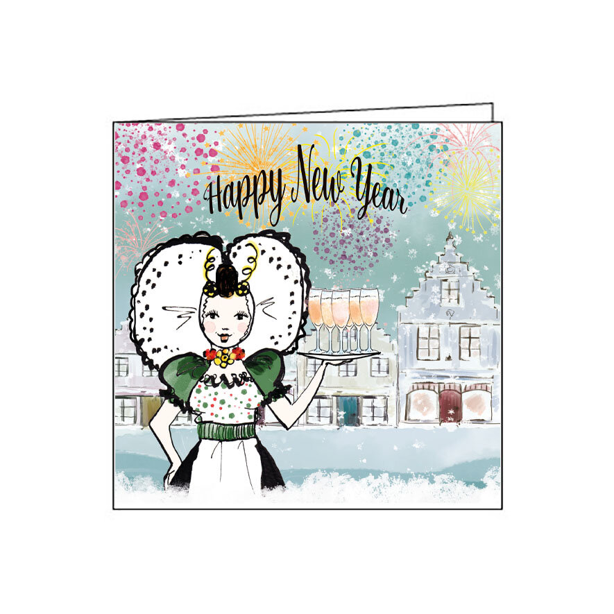Happy New Year! Deze set van 5 luxe dubbele nieuwjaarskaarten toont een Zeeuws meisje in traditionele klederdracht, met een glas champagne in haar handen, klaar om nieuwjaarswensen te versturen. De kaarten worden geleverd met mooie enveloppen en zijn ideaal om je familie, vrienden of collega’s feestelijk te verrassen.