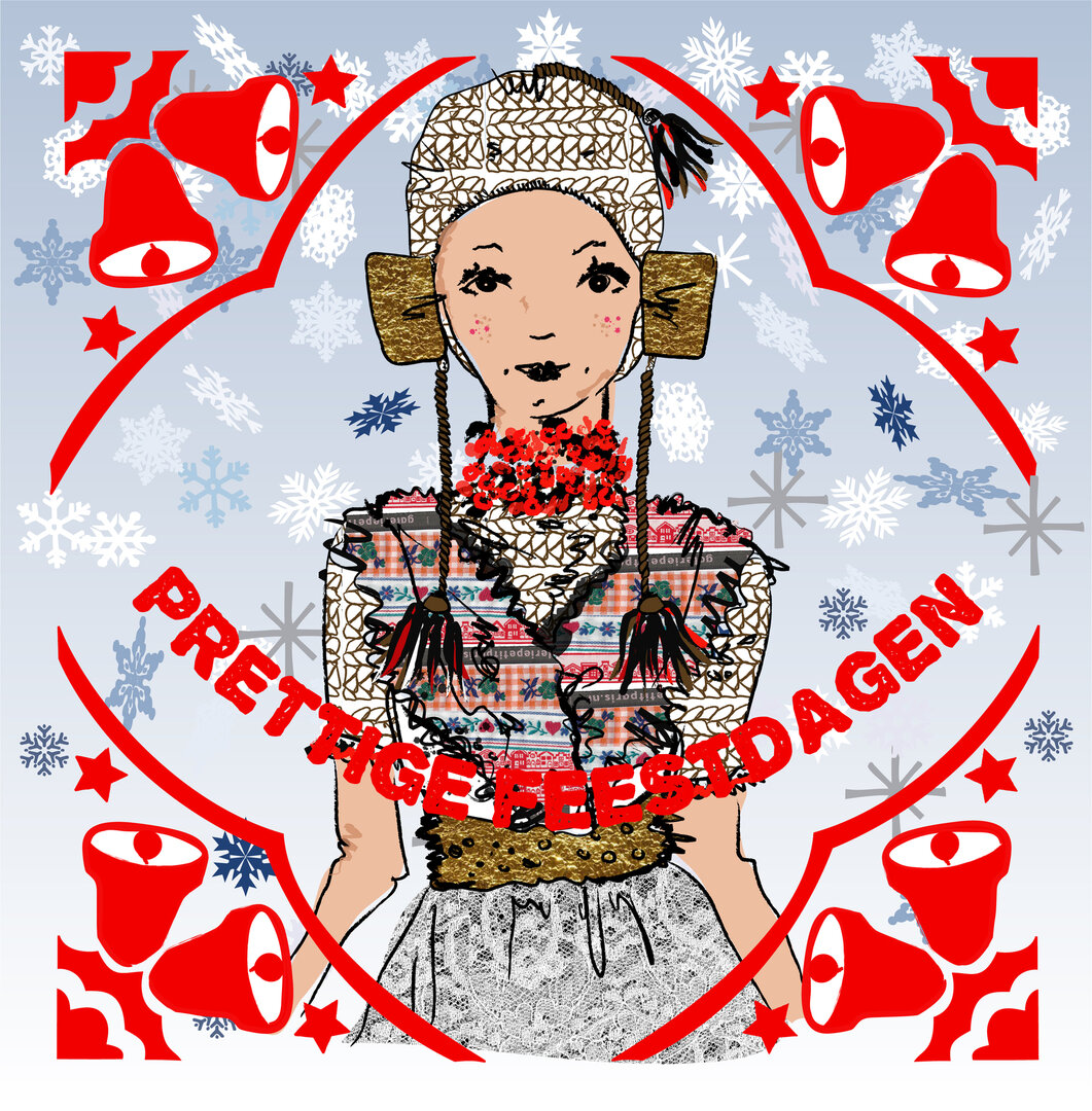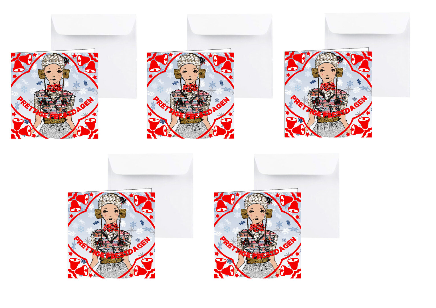 Set van 5 luxe wenskaarten met mooie envelop Dubbele kerstkaart met Zeeuws meisje in klederdracht in een sneeuwlandschap. Stuur warme feestgroeten met een traditionele Zeeuwse touch.