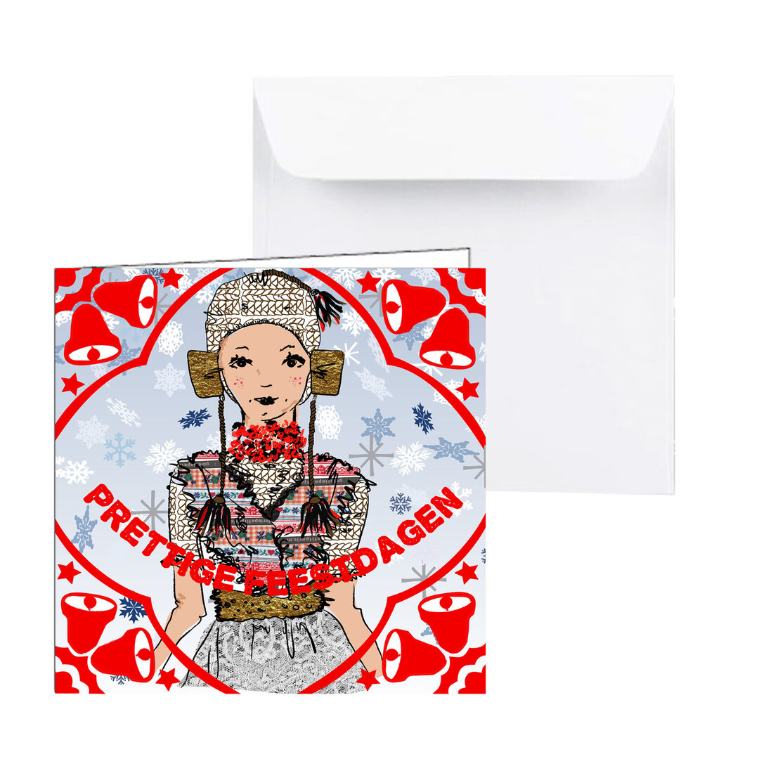Prettige kerstdagen! Deze dubbele wenskaart toont een Zeeuws meisje in traditionele Zeeuwse klederdracht, spelend in een prachtig sneeuwlandschap. De kaart wordt geleverd met een bijpassende rode envelop en is ideaal om je kerst- en nieuwjaarswensen persoonlijk en feestelijk te versturen.