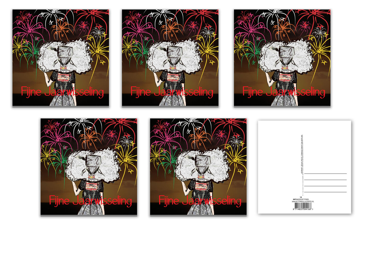 Set van 5 enkele ansichtkaarten met een Zeeuws meisje in klederdracht, ketting van bloedkoraal en vuurwerk op de achtergrond. Tekst: “Fijne Jaarwisseling”. Formaat 15 x 15 cm, zonder envelop.